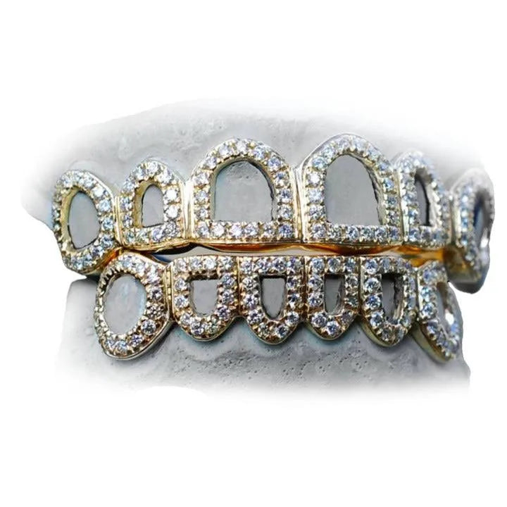 Made of solid .925 Sterling silver and dripping ice thanks to our using 5A flawless CZs, this completely bustdown iced out custom grill set is a must-have! You can't go wrong with this icy set! If gold is what you need, we offer the option of upgrading to 10k, 14k, 18k yellow, white, or rose gold.